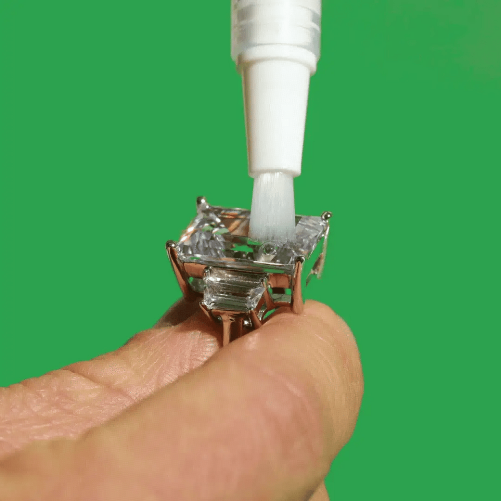 A precision cleaning pen engineered for gemstones and jewelry. The ultra-fine soft-tip brush delivers plant-based cleaning solution directly into prong settings, under-stone crevices, and lens surfaces where everyday grime, lotion, and oil accumulate.